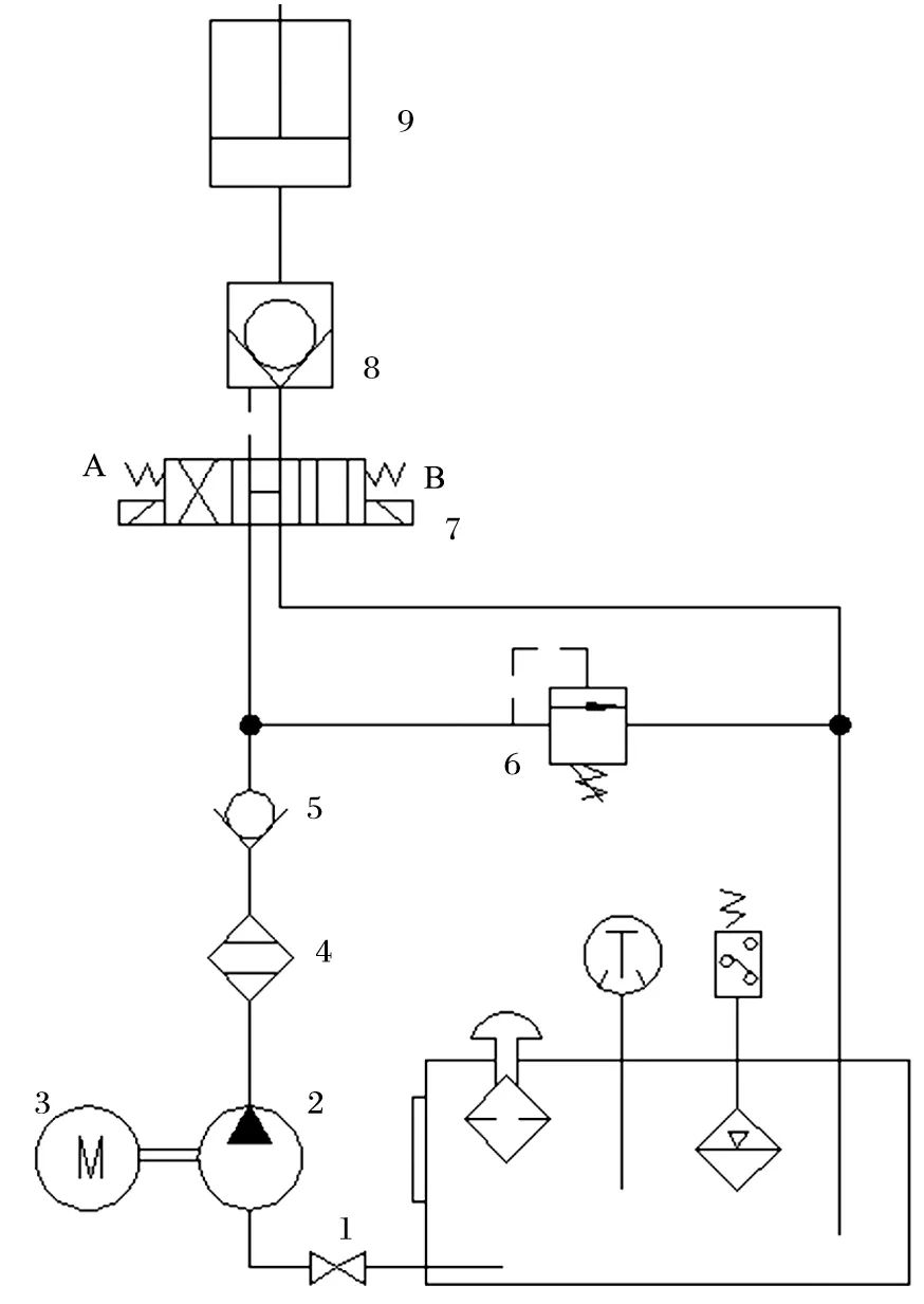 1.球阀 2.液压泵 3.电动机 4.过滤器 5.单向阀 6.溢流阀7.电磁换向阀 8.液控单向阀 9.液压缸